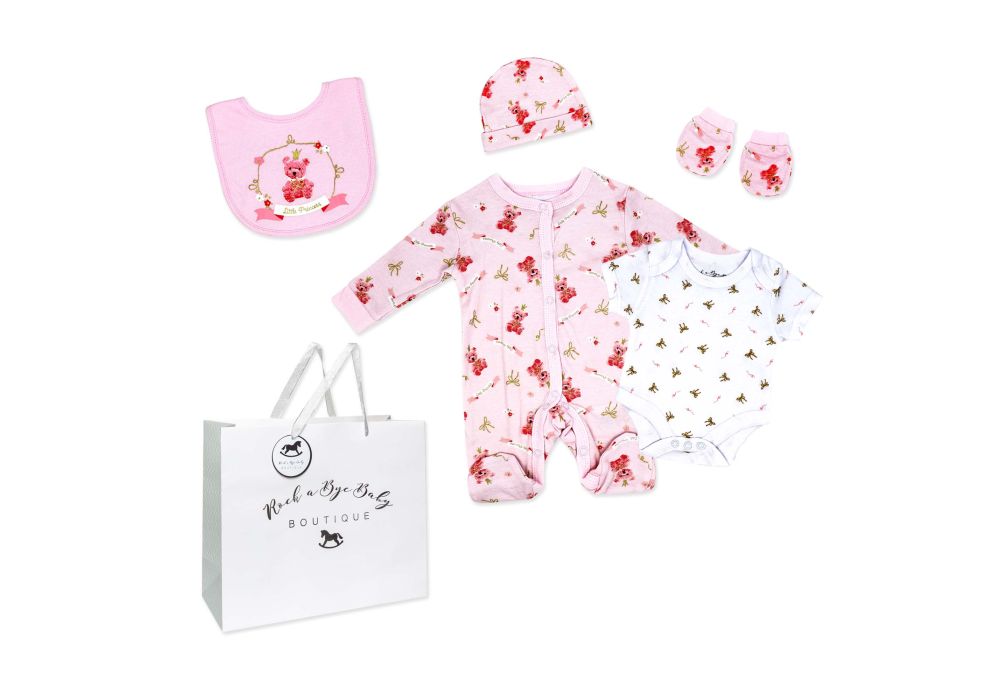 Set includes: Sleeper, Bodysuit, Hat, Mitts, and Bib